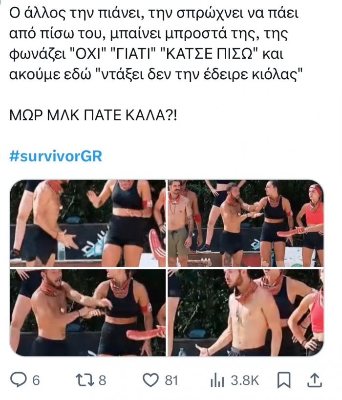 Στο νέο επεισόδιο που πρόκειται να δούμε, από το τρέιλερ που κυκλοφόρησε βλέπουμε τον Αλέξανδρο Κούρτοβικ - που μαζί με την Κέλλυ Μποφίλιου και τον Γιάννη Ρέβη είναι υποψήφιος προς αποχώρηση - να κάνει στην άκρη την Μαντίσα την ώρα που προσπαθεί να βοηθήσει την συμπαίκτριά τους στον στόχο. Ο ίδιος και κινήθηκε απειλητικά προς το μέρος της και της έβαλε τις φωνές. Βέβαια, όπως βλέπουμε στη συνέχεια του τρέιλερ το ίδιο κάνει και ο Δημήτρης Θεοδωρόπουλος.