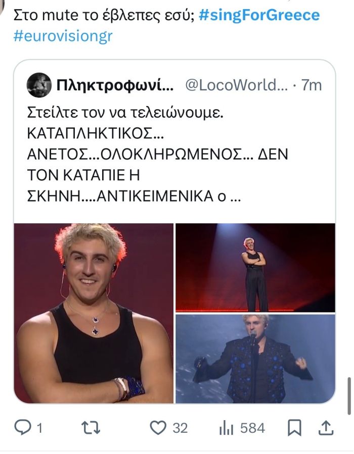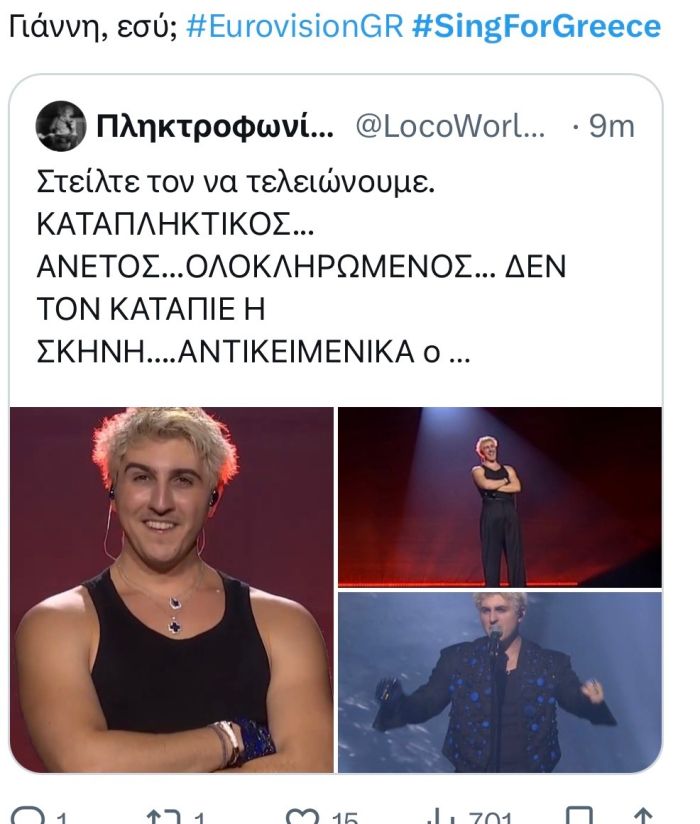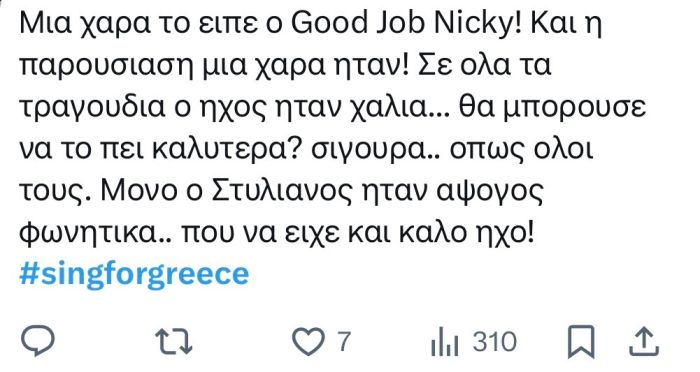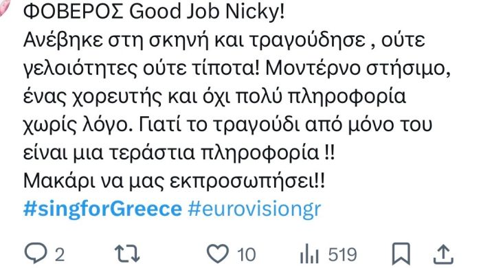 Πάντως, ο Good Job Nicky σίγουρα δεν απογοήτευσε τους αδερφούς του. Ο Χάρης Βαρθακούρης μάλιστα, βλέποντας την εμφάνισή του έκανε αμέσως ανάρτηση πως ετοιμάζεται να βγάλει εισιτήριο για Βιέννη. Βέβαια, από κάτω του σχολίασαν όσοι είχαν αντίθετη άποψη πως καλά θα κάνει για να δει τον Aκύλα από κοντά.