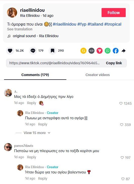 Η Ρία, έχει τις τελευταίες ημέρες δεχτεί ορυμαγδό από αρνητικά σχόλια για τη σχέση της, ειδικά σε ό,τι αφορά το ταξίδι στην Ταϋλάνδη, κι ακόμα πιο ειδικά για το ποιος πλήρωσε, αν είναι ο Αλεξάνδρου άεργος και τι του βρίσκει τελικά και είναι μαζί του.