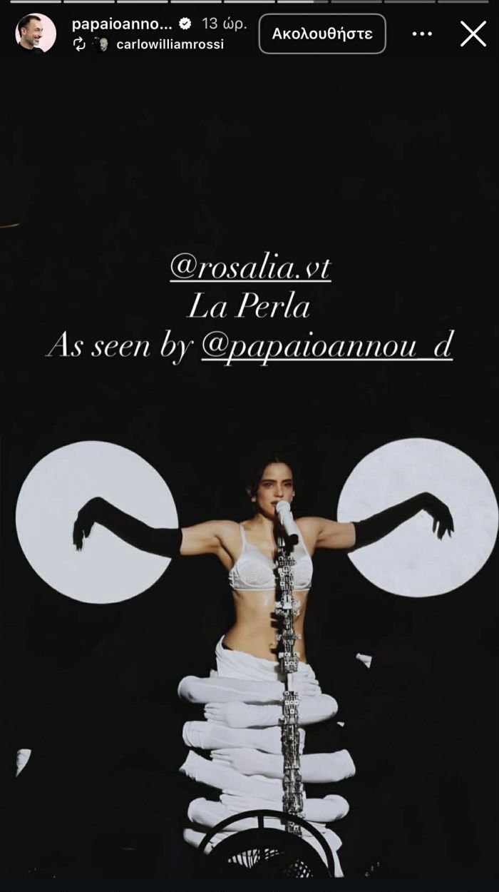 Ο Δημήτρης Παπαϊωάννου, διεθνώς αναγνωρισμένος δημιουργός, ο οποίος βρέθηκε και ο ίδιος στη γαλλική πόλη για την πρεμιέρα του tour, επιμελήθηκε τη σκηνική παρουσία της Rosalía στο κομμάτι «La Perla» προσδίδοντας μια θεατρικότητα που σπάνια συναντάμε σε pop tours. Η ματιά του Παπαϊωάννου ήταν εμφανής σε κάθε λεπτομέρεια: από τον τρόπο που το φως αγκάλιαζε τη φιγούρα της, μέχρι την απόλυτη πλαστικότητα των κινήσεών της που θύμιζαν κινούμενο έργο τέχνης.