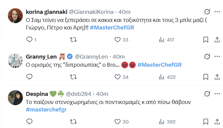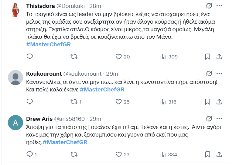 Το κοινό δε συγκρατήθηκε στα σχόλιά του στο Χ για την υποκρισία του αρχηγού και της κλίκας του. Γιατί την ίδια στιγμή παράλληλα, ο Σαμ μιλούσε επίσης υποτιμητικά για τη Wasan λέγοντας πως είχε κάνει το χειρότερο πιάτο.