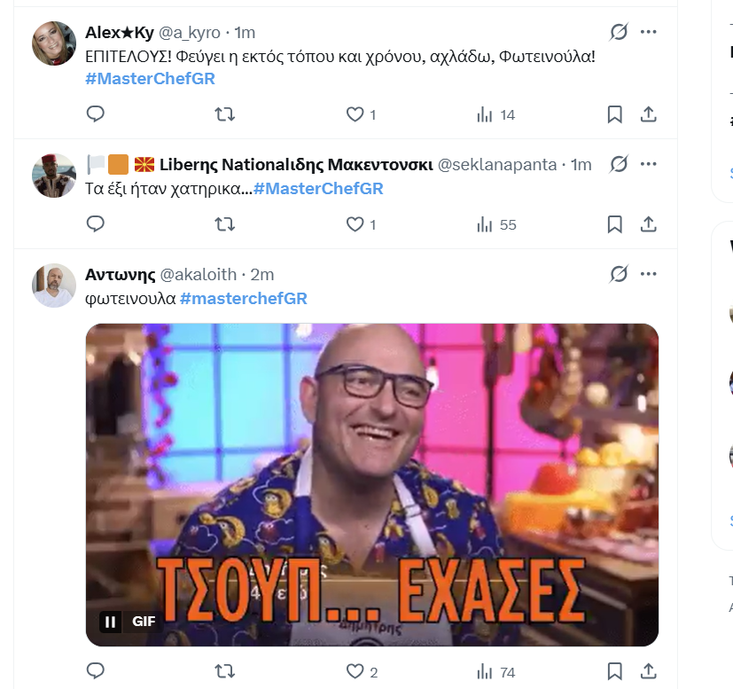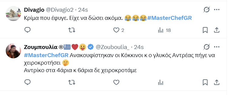 Μετά παρενέβησαν και οι κόκκινοι με φωνές και εντολές, η Φωτεινούλα μπερδεύτηκε και δεν ήξερε που πάει η κάθε σάλτσα - σε ένα όμως πραγματικά δύσκολο πιάτο - η Μενεξιά επίσης πιέστηκε γιατί ούτε και εκείνη γνώριζε τι κάνει και κάποια στιγμή έριξε και το «σκάσε» στον εξώστη, πάνω στην ένταση της στιγμής.