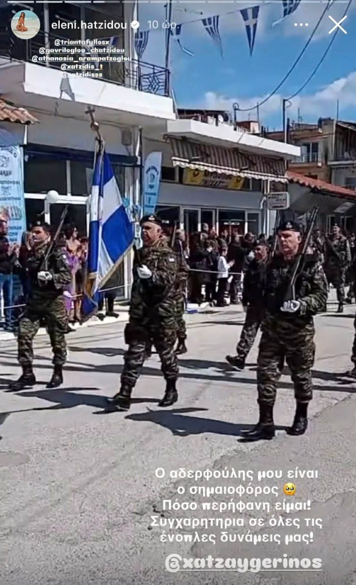 «Ο αδερφούλης μου είναι ο σημαιοφόρος. Πόσο περήφανη είμαι! Συγχαρητήρια σε όλες τις ένοπλες δυνάμεις μας!», έγραψε χαρακτηριστικά η Ελένη Χατζίδου δημοσιεύοντας ένα βίντεο με τον ίδιο από την παρέλαση.