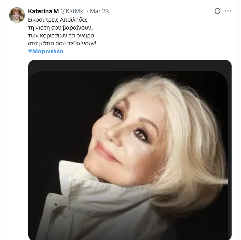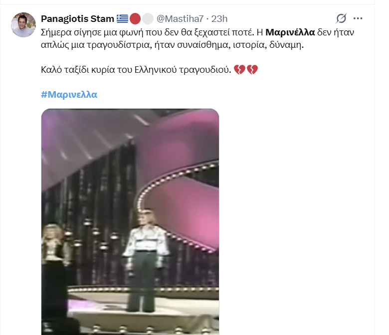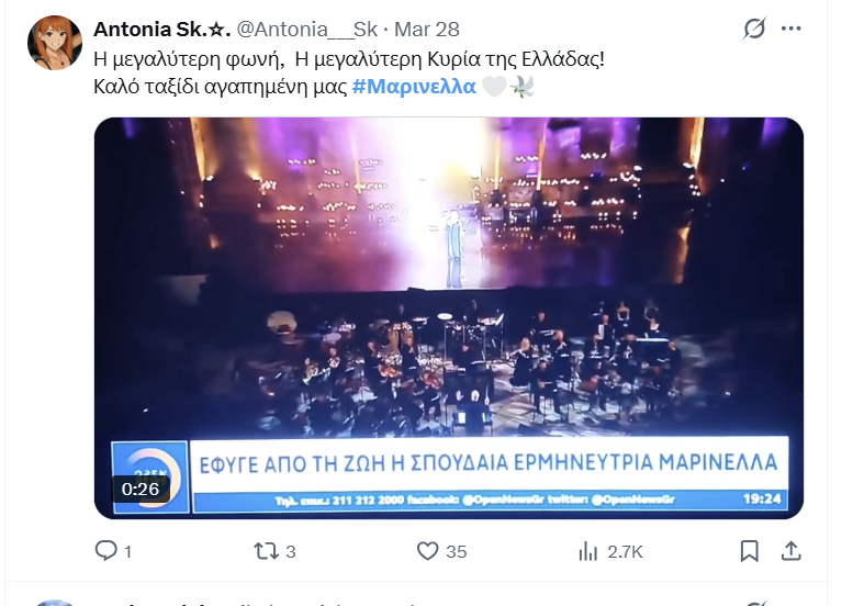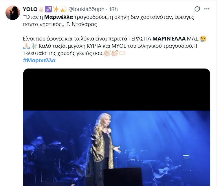 Στα social media εδώ τις τελευταίες ώρες η Μαρινέλλα είναι μόνιμο trend και όλοι εκφράζουν την αγάπη τους για τη γυναίκα φαινόμενο, για τη φωνή που υψωνόταν στον ουρανό. Η σπάνιας αντοχής τραγουδίστρια που διατηρούσε ακέραια τη φωνή της ακόμη και στην 8η δεκαετία της ζωής της, ήταν γνωστή και αγαπημένη όλων των γενεών.