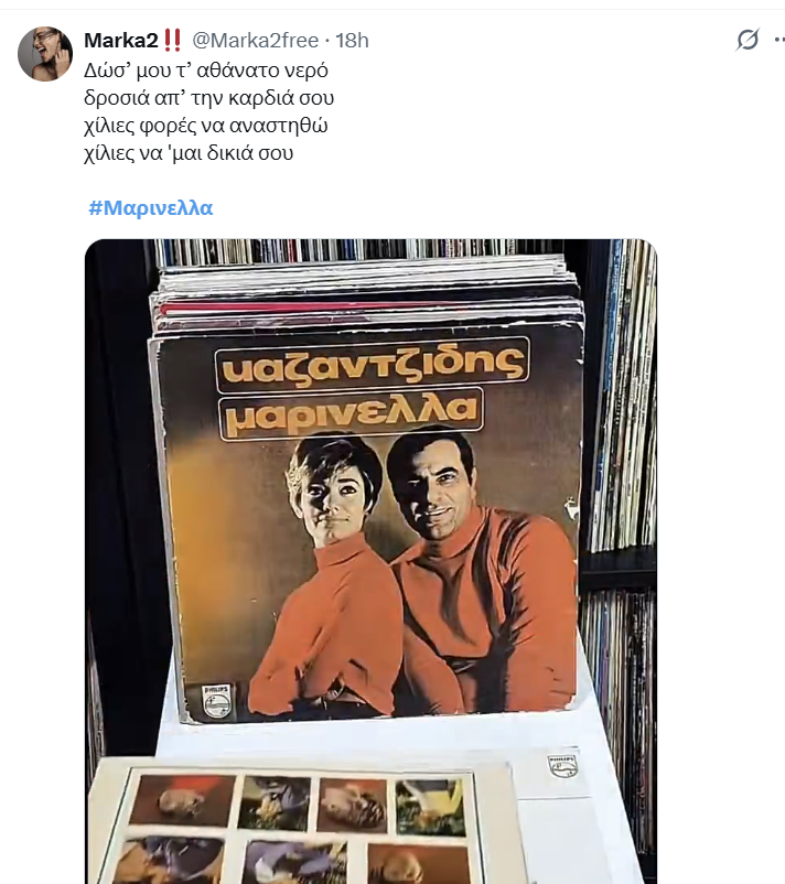 Ένα ακόμη ωραίο στιγμιότυπο που είδαμε στο Χ αφορούσε σε μία συνεργασία της Μαρινέλλας, λιγότερη γνωστή. Με τον Γιώργο Μαρίνο που «έφυγε» και εκείνος από τη ζωή πριν από λίγες μέρες, να τραγουδούν για την Οδό Ονείρων του Μάνου Χατζιδάκι. Δύο θρύλοι μαζί.