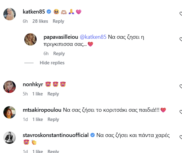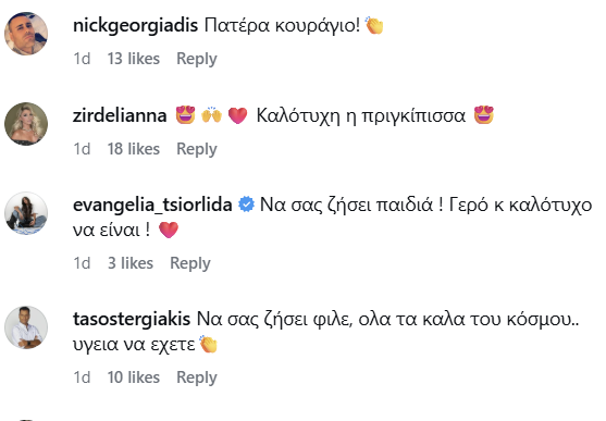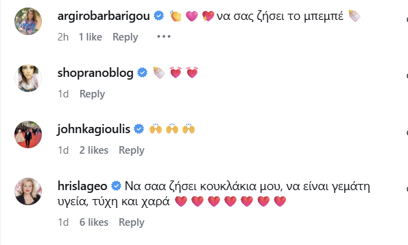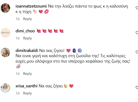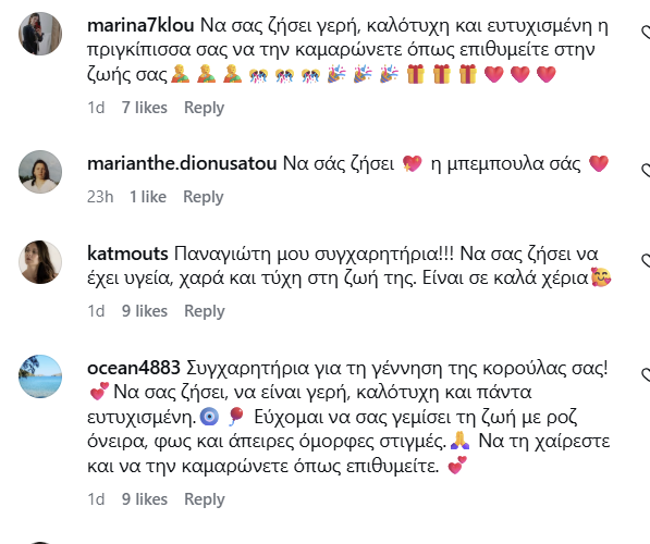 Πάρα πολλοί επώνυμοι αλλά και φίλοι ευχήθηκαν και διαδικτυακά, στην πρώτη ανάρτηση που έκανε και ο Παναγιώτης Κουτσουμπής στο Instagram, με μία φωτογραφία της Κατερίνας και emoji που περιλάμβαναν μία καρδιά και ένα μπιμπερό.