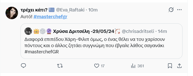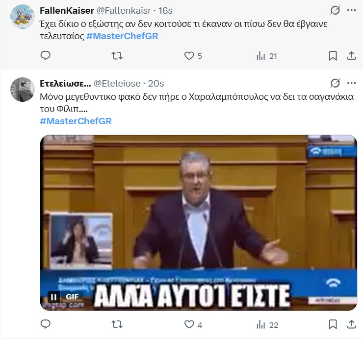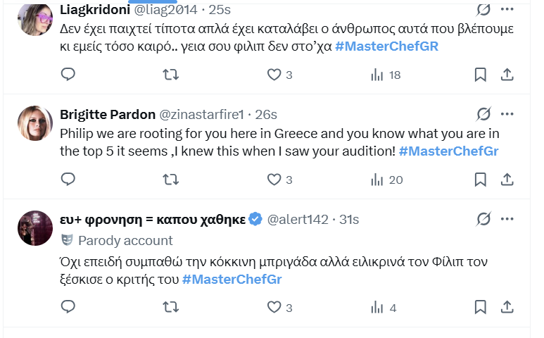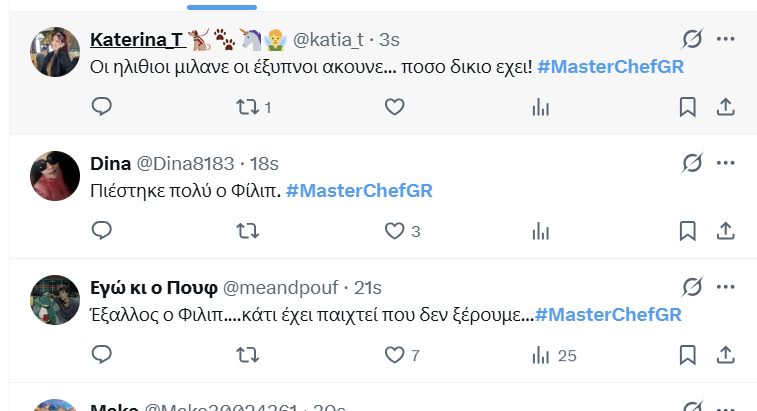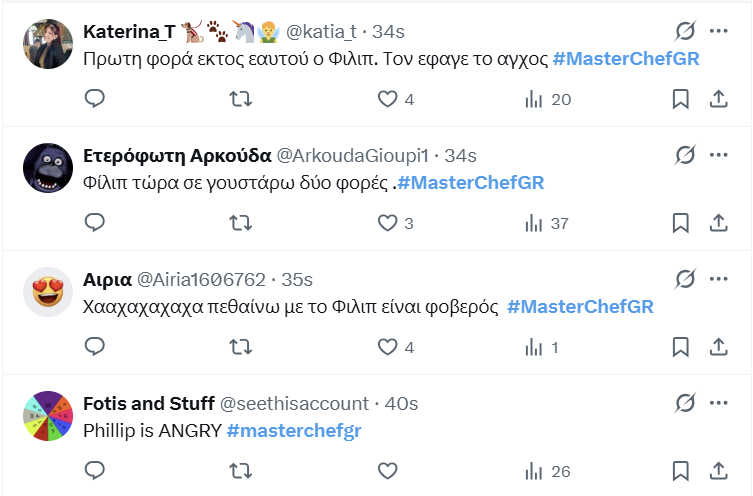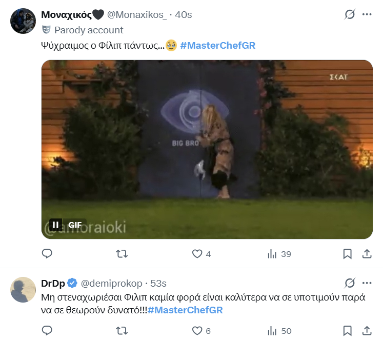 Μaster του είδους (σιτς πλεκτάνες) είναι φυσικά ο Γιώργος Αχλαδιώτης, που υπονοείται πως αποτυγχάνει και με υπάρχει η υποψία πως αποχωρεί από τον διαγωνισμό. Ωστόσο χθες ζήσαμε και μία παράδοξη στιγμή. Με τον Φίλιπ να βγαίνει εκτός εαυτού με την άδικη βαθμολογία στην τελευταία δοκιμασία.