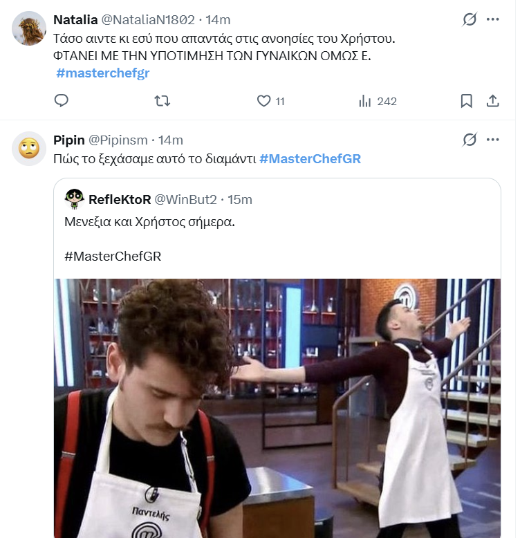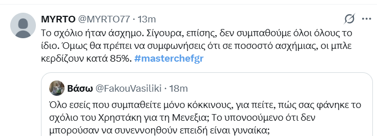Το μεγαλύτερο φάουλ όμως προήλθε χθες από τους κόκκινους. Ο Χρήστος ήταν αρκετά προσβλητικός προς τη Μενεξιά, η οποία δεν κατάλαβε τις οδηγίες του και εκείνος την ειρωνεύτηκε επειδή είναι γυναίκα.