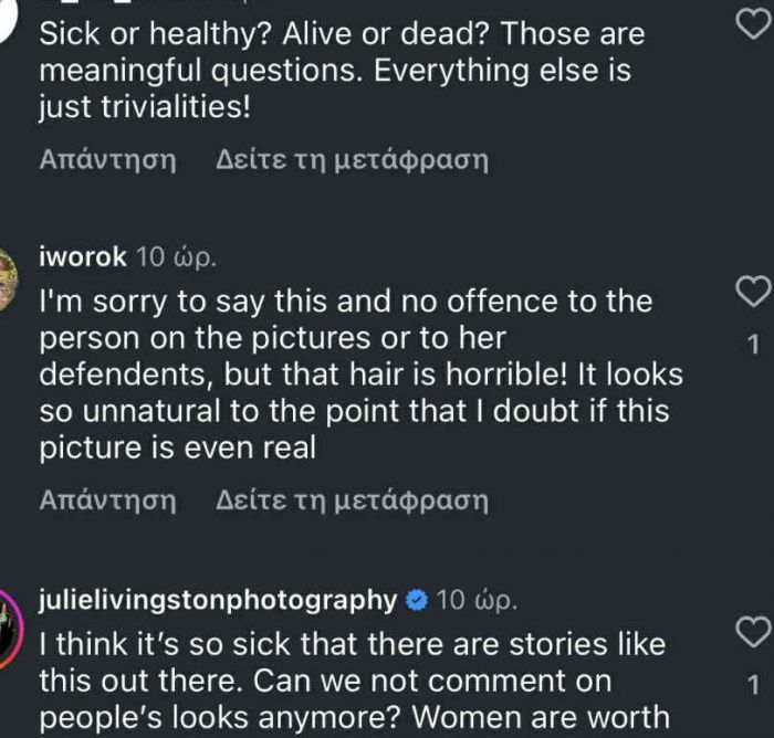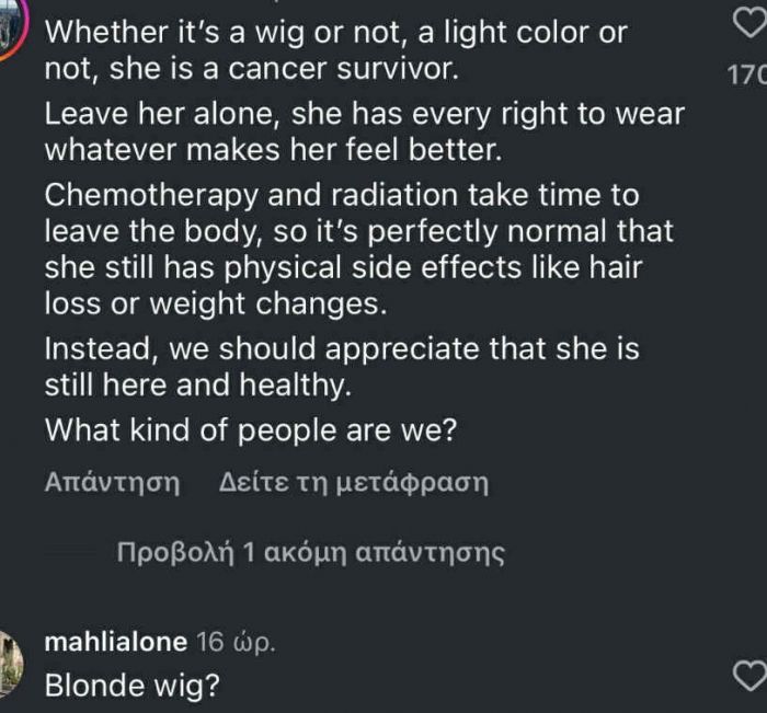 Αντί να χαρούμε που μια γυναίκα βγήκε δυνατή από μια τόσο σκληρή δοκιμασία, κάποιοι θέλουν να την φανταστούν χωρίς μαλλιά για να νιώσουν καλύτερα ή απορούν γιατί ενώ έκανε θεραπείες δεν εμφανίστηκε στο κοινό αδύναμη και έτοιμη να την κατασπαράξουν;