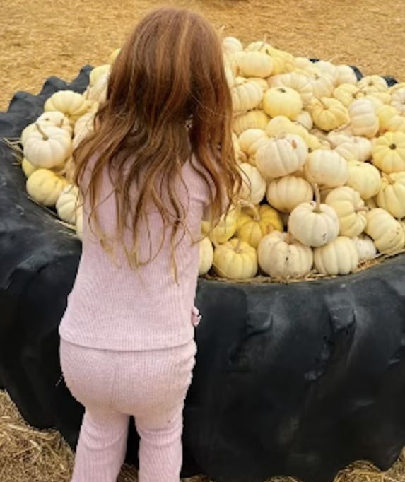 Σε ένα ακόμη τρυφερό στιγμιότυπο, η Lili ψάχνει ανάμεσα σε απαλές κίτρινες κολοκύθες, απολαμβάνοντας το παιχνίδι με τα χρώματα και τις υφές του φθινοπώρου.