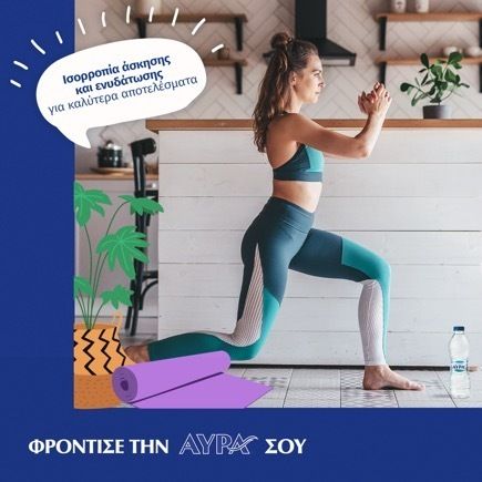 Extra tip: Μην ξεχνάς πως ενώ γυμνάζεσαι, το σώμα σου χάνει υγρά, λόγω της εφίδρωσης. Καλό θα ήταν, λοιπόν, να έχεις δίπλα σου ένα μπουκαλάκι Φυσικό Μεταλλικό Νερό ΑΥΡΑ, τον φυσικό «σύμμαχο» που θα σε βοηθά να αναπληρώνεις τα υγρά που χάνεις και θα σε κρατάει ενυδατωμένη και active κατά τη διάρκεια του workout σου.