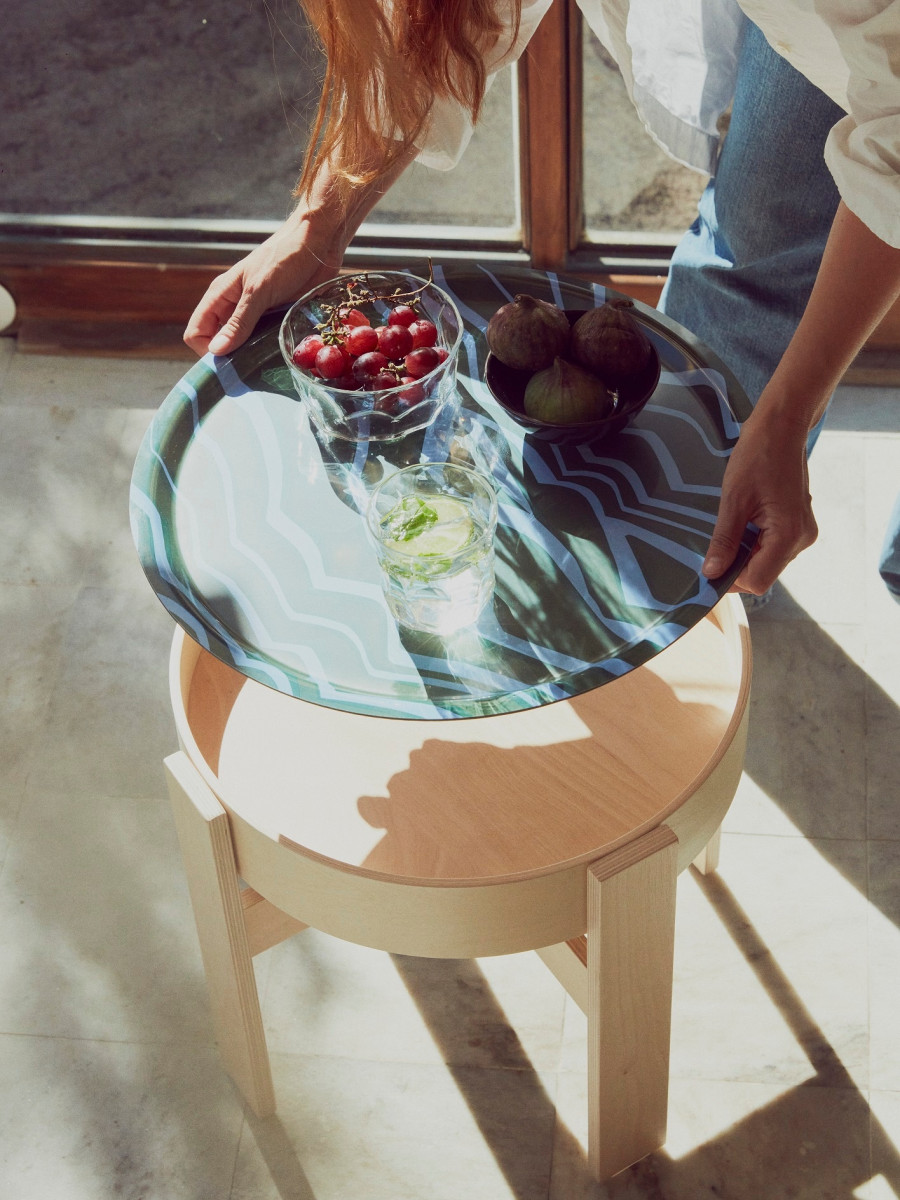 Ένα από τα πιο χαρακτηριστικά μοτίβα αυτής της συλλογής είναι ένα μεγάλο πράσινο φύλλο με ροζ φλέβες εμπνευσμένο από το φυτό ραβέντι που συχνά φυτρώνει δίπλα σε κτίρια σάουνας στη Φινλανδία. Τα πλατιά πράσινα φύλλα πρωταγωνιστούν σε δίσκους σερβιρίσματος, κουρτίνες μπάνιου, κιμονό, τσάντες μεταφοράς και σε άλλα εντυπωσιακά προϊόντα.