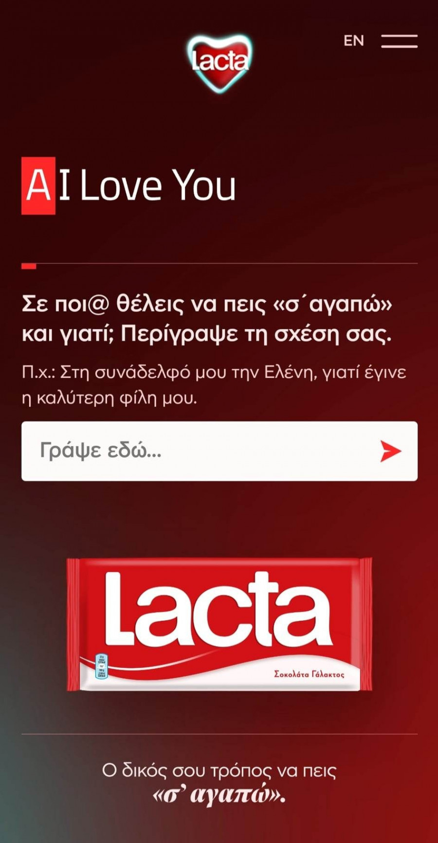 Αν θέλεις και εσύ, λοιπόν, να πεις «σ’ αγαπώ» στον σύντροφο, τη συνάδελφο, την κολλητή ή την αδερφή σου, αλλά διστάζεις ή δεν βρίσκεις τα λόγια, η Lacta με την πρωτοποριακή εφαρμογή AI Love You ξέρει τον πιο απρόσμενα γλυκό τρόπο για να το κάνεις! Μην αφήσεις τα συναισθήματά σου να σε προσπεράσουν, περιμένοντας στωικά την κατάλληλη στιγμή, αλλά επικοινώνησέ τα με ένα AI γράμμα αγάπης προς τους ανθρώπους που αξίζει να τα γνωρίζουν, αφού έχουν κερδίσει με το «σπαθί» τους μία ξεχωριστή θέση στην καρδιά σου.