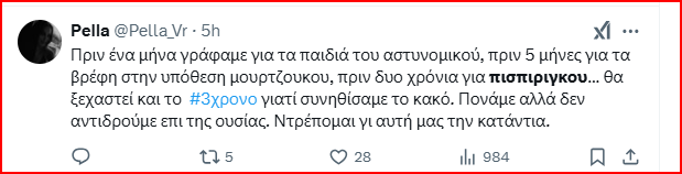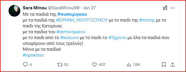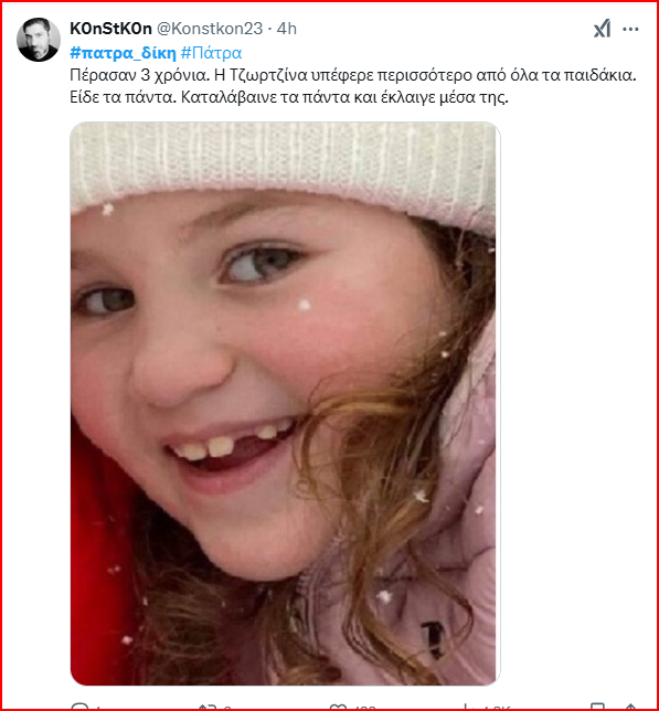 Στο Χ και γενικότερα στα social media, όλοι ζητούν να δικαιωθεί η μνήμη της Τζωρτζίνας, της Μαλένας και της Ίριδας. Σε μία χρονική στιγμή που οι ειδήσεις για κακοποιήσεις μικρών παιδιών, με πρόσφατη τη συγκλονιστική υπόθεση του 3χρονου στο Ηράκλειο της Κρήτης, συνεχίζουν να είναι στα πρωτοσέλιδα.