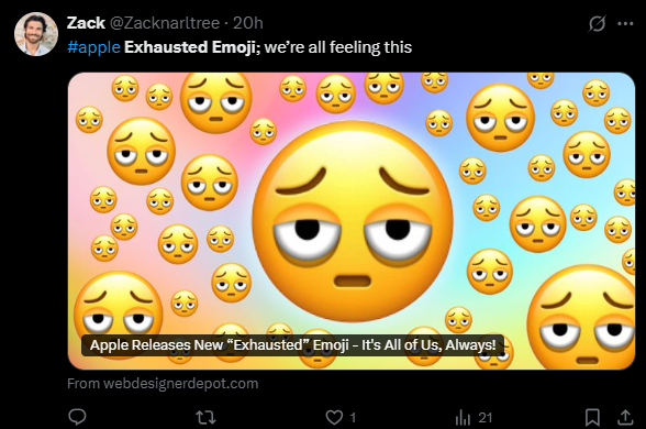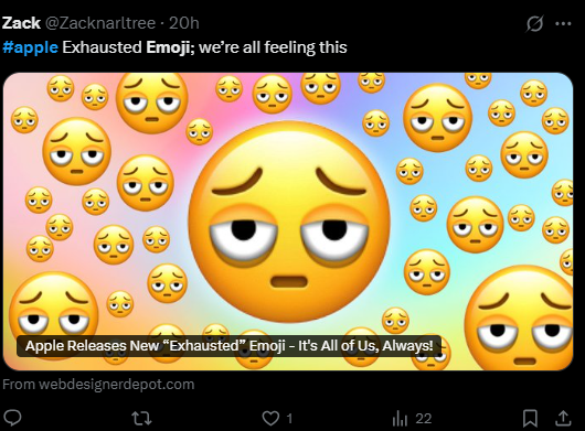 Οι χρήστες του διαδικτύου δηλώνουν ενθουσιαμένοι με τη νέα προσθήκη του emoji από την Apple που δείχνει την κούρασή τους. Πολλοί είναι εκείνη που έκαναν μια ανάρτηση λέγοντας πως επιτέλους η Apple δημιούργησε ένα emoji για αυτούς κι όπως φαίνεται αυτό το εικονίδιο θα είναι ίσως το πιο χρησιμοποιημένο της χρονιάς.
