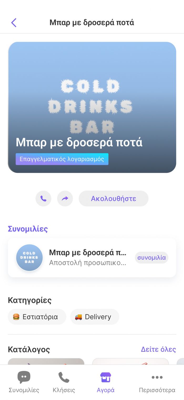Η Αγορά Viber θα είναι διαθέσιμη για όλους τους χρήστες στην Ελλάδα τις ερχόμενες εβδομάδες, προσφέροντας έναν δυναμικό χώρο για την ανακάλυψη τοπικών καταστημάτων και υπηρεσιών. Με νέες επιχειρήσεις να προστίθενται καθημερινά μέσω δωρεάν Επαγγελματικών Λογαριασμών, οι χρήστες θα έχουν πάντα νέες επιλογές για να εξερευνήσουν και να συνδεθούν. Απλώς πατήστε το εικονίδιο της Αγοράς Viber στην αρχική οθόνη για να ξεκινήσετε. Περισσότερες λειτουργίες θα προστεθούν σύντομα, συμπεριλαμβανομένων νέων τρόπων και ειδικών εργαλείων για τις επιχειρήσεις ώστε να ξεχωρίζουν και να συνδέονται μαζί σας.