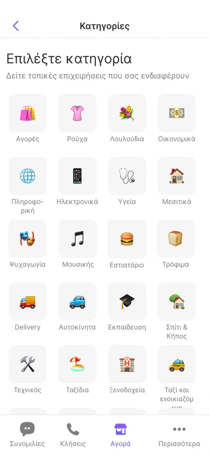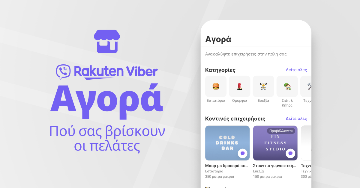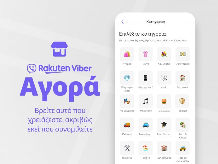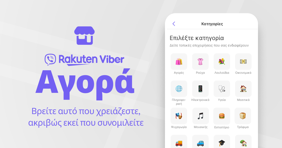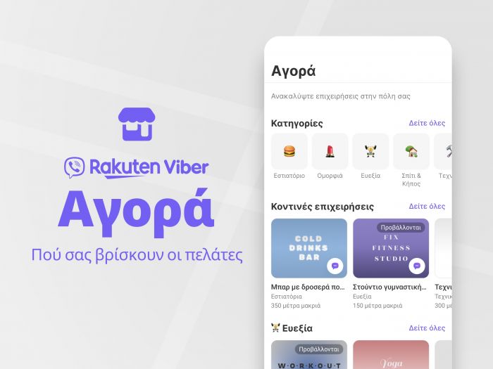 Η Rakuten Viber ανακοινώνει σήμερα την κυκλοφορία της Αγοράς Viber στην Ελλάδα. Μέσα από την Αγορά, οι χρήστες του Viber μπορούν εύκολα να βρουν και να συνδεθούν γρήγορα με χιλιάδες τοπικές επιχειρήσεις που προσφέρουν μεγάλη ποικιλία προϊόντων και υπηρεσιών, όπως κομμωτήρια, υπηρεσίες υγείας, εστιατόρια, καταστήματα λιανικής και πολλά άλλα.