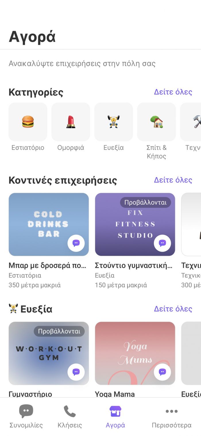 Όταν οι χρήστες ανοίγουν τη νέα καρτέλα Αγορά, μπορούν να επιλέξουν να μοιραστούν την ακριβή τοποθεσία τους για να δουν τις πλησιέστερες επιχειρήσεις. Εάν προτιμούν να μην κοινοποιήσουν την τοποθεσία τους, θα δουν μια επιλογή επιχειρήσεων με βάση γενικές πληροφορίες τοποθεσίας. Καθώς οι χρήστες μετακινούνται στην Ελλάδα, τα αποτελέσματα ενημερώνονται αυτόματα. Η Αγορά Viber αναδεικνύει τις πιο σχετικές και ενεργές επιχειρήσεις, διευκολύνοντας τους χρήστες να ανακαλύψουν χρήσιμες τοπικές επιλογές.