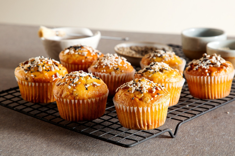 Όταν δεις πως είναι έτοιμα, τα αφαιρείς από τον φούρνο, ξεφορμάρεις και περιμένεις να κρυώσουν. Στο ενδιάμεσο, ζεσταίνεις το μέλι και το περιχύνεις στα muffins. Ως toppings πασπαλίζεις το σουσάμι και τον υπόλοιπο ηλιόσπορο. Και τόσο απλά τις ένα τέλειο dessert.