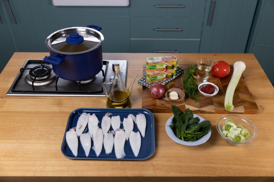 Η προετοιμασία της συνταγής είναι σχετικά απλή. Πιο αναλυτικά, σε μία μεγάλη κατσαρόλα θα ρίξεις το ελαιόλαδο και θα σοτάρεις το κρεμμύδι με το σκόρδο μέχρι να μαραθούν. Στη συνέχεια, θα ρίξεις το πράσο, τον πελτέ, τη μουστάρδα, τον Knorr «Σπιτικό» Ζωμό Λαχανικών και τα καλαμαράκια.