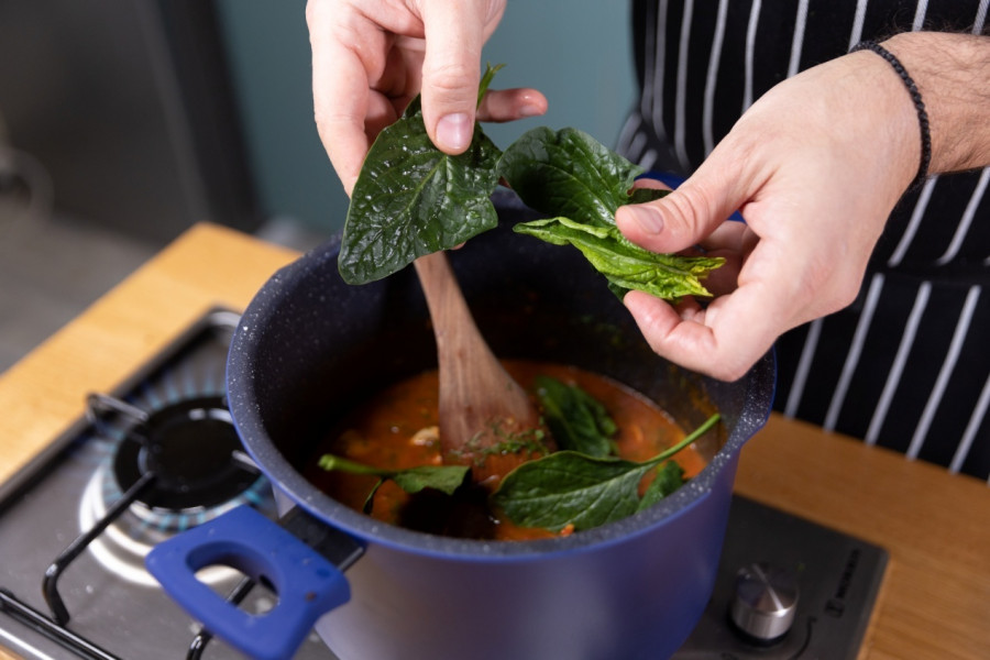 Συνεχίζοντας τα βήματα για την ολοκλήρωση της συνταγής, θα σβήσεις με το κρασί, θα προσθέσεις την ντομάτα, το σπανάκι, τον άνηθο, το αλάτι, το πιπέρι και θα ανακατέψεις. Θα χαμηλώσεις τη φωτιά σε μέτρια θερμοκρασία και θα μαγειρέψεις για 45 λεπτά.
