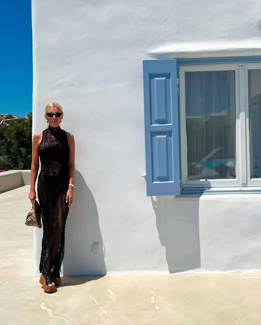 Σε δεύτερη φάση την είδαμε με ένα maxi μαύρο φόρεμα με μεγάλη, αραιή πλέξη και turtleneck λαιμό. Από μέσα φόρεσε ένα cut out sexy ολόσωμο μαγιό και μαύρα γυαλιά ηλίου, ενώ την εμφάνιση ολοκλήρωσε ένα ζευγάρι platformed mules και ένα animal printed bucket hat. Και τα δύο looks ήταν εξίσου εντυπωσιακά, το καθένα με τον τρόπο του, δείχνοντας δύο διαφορετικού τρόπους να υιοθετήσουμε την τάση του crochet.