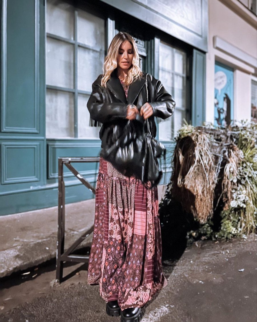 Ξέρουμε ότι η Αθηνά λατρεύει τα prints. Οπότε δεν θα μπορούσε να τα αποχωριστεί ούτε και κατά τη νέα σεζόν. Και γιατί να το κάνει, άλλωστε; Αφού μπορεί πολύ απλά να συνδυάσει τα printed φορέματα της με τα αγαπημένα της μποτάκια. Πιο συγκεκριμένα, η Αθηνά επέλεξε δύο maxi shirt dresses, σε άνετη αέρινη γραμμή, με κλασικά κουμπιά και boho λεπτομέρειες, όπως είναι τα μανίκια καμπάνα και τα λαχούρια. Στο πρώτο look που δημιούργησε διάλεξε ένα shirt dress σε μπορντό αποχρώσεις και το συνδύασε με ένα μαύρο, δερμάτινο jacket και μαύρα, chunky μποτάκια σε στυλ biker.