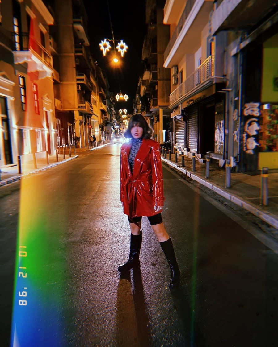 Αυτή η επιλογή είναι must για σένα, που αγαπάς τις extravagant επιλογές. Η Κλέλια είναι ένα κορίτσι που αγαπά τη μόδα και αυτό φαίνεται και από το Instagram account της, το οποίο είναι γεμάτο με δημιουργικά σύνολα και edgy items. Ένα από αυτά είναι και η κατακόκκινη καμπαρντίνα της από glossy vinyl ύφασμα, που μας ξετρέλανε. Είναι ένα κομμάτι από την limited collection της Ελληνίδας σχεδιάστριας Vassia Kostara, και η Κλέλια τόλμησε ένα ανατρεπτικό styling.