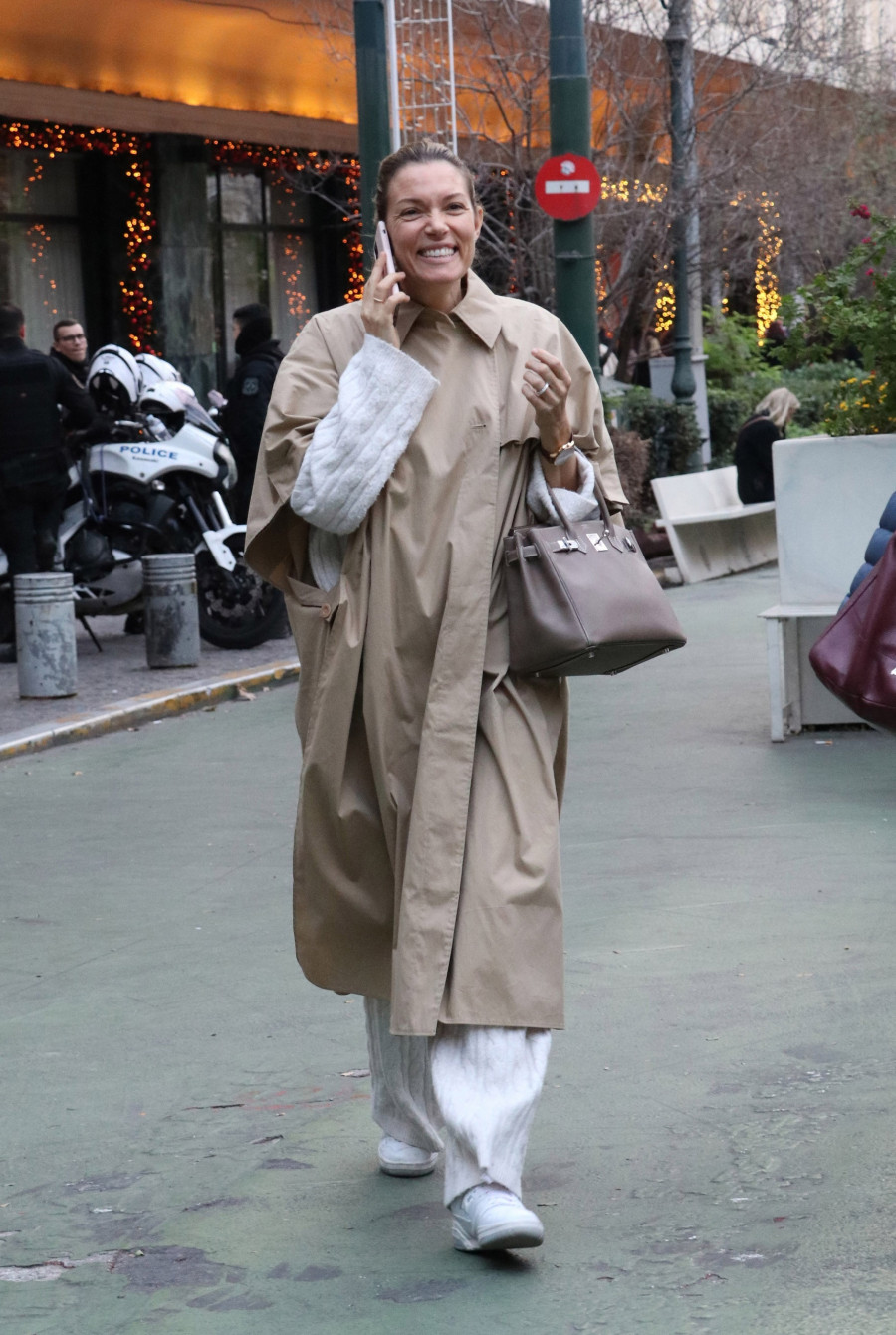 Ας ξεκινήσουμε με τα χρώματα και ας παρατηρήσουμε ότι η Βίυκ κινήθηκε έξυπνα σε neutral παλέτα. Επέλεξε, λοιπόν, ένα total knitted σύνολο, με φαρδύ παντελόνι και ασορτί πουλόβερ σε ivory χρώμα, ενώ από πάνω φόρεσε το πιο διαχρονικό πανωφόρι. Την beige καμπαρντίνα. Το συγκεκριμένο κομμάτι έχει κοντά φαρδιά μανίκια, που διευκολύνουν την κίνηση, ενώ η Βίκυ την κούμπωσε μέχρι πάνω. Από κάτω έβαλε τα all, λευκά, δερμάτινα sneakers της και συμπλήρωσε το σύνολο με χρυσά, διακριτικά κοσμήματα και μία Birkin bag του οίκου Hermes, σε μια ιδιαίτερη απόχρωση ανάμεσα σε γκρι και beige.