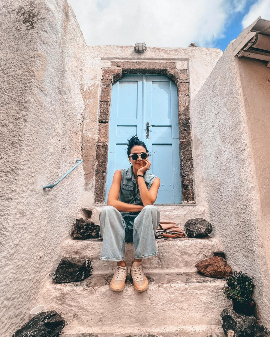 Εκτός από τις λήψεις και τα τοπία της Σαντορίνης εμείς ξεχωρίσαμε φυσικά και τα δύο looks που έκανε η Ιωάννα μέσα σε αυτές τις μέρες. Και τα δύο είχαν ως βασικό οτυς συστατικό το αγαπημένο της τζιν παντελόνι, αφού η Ιωάνν είναι ένα γνήσιο denim girl και προτιμά συχνά τα denim looks τόσο στην καθημερινότητά της, όσο και στα κάποια βραδινά outfits με το αντίστοιχο styling.