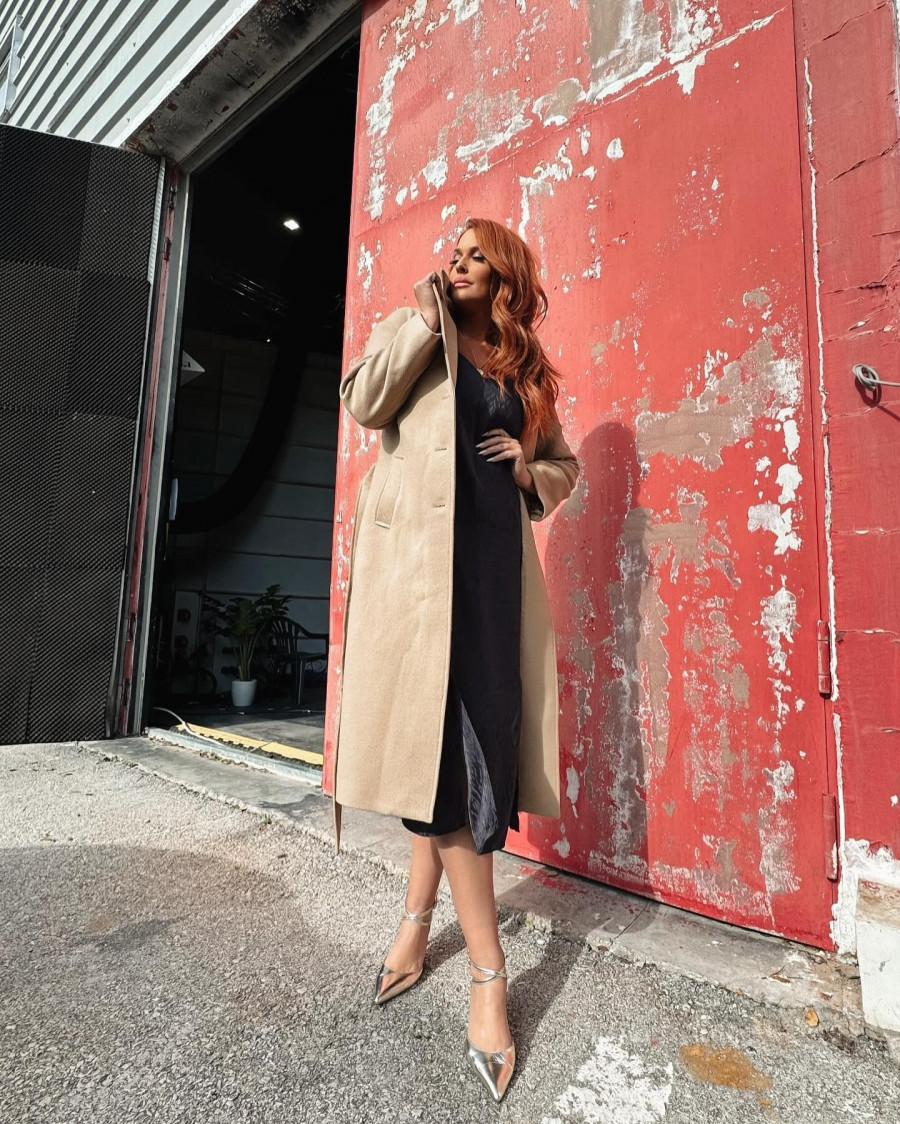 Σε κλασική γραμμή με μεγάλα κουμπιά στο τελείωμα, μεγάλα πέτα και ζώνη που δένει στη μέση και τονίζει όμορφα τη σιλουέτα μιλάμε για ένα παλτό, που μπορεί να αντικαταστήσει το αναμενόμενο μαύρο, γιατί ταιριάζει με όλα τα χρώματα της ντουλάπας μας και δίνει αυτόν τον quiet luxury τόνο που θέλουμε στο χειμερινό μας στυλ. Η Σίσυ το συνδύασε με μαύρο, ανάλαφρο, midi φόρεμα και ένα ζευγάρι statement γόβες σε ασημί δέρμα με λουράκια χιαστί.