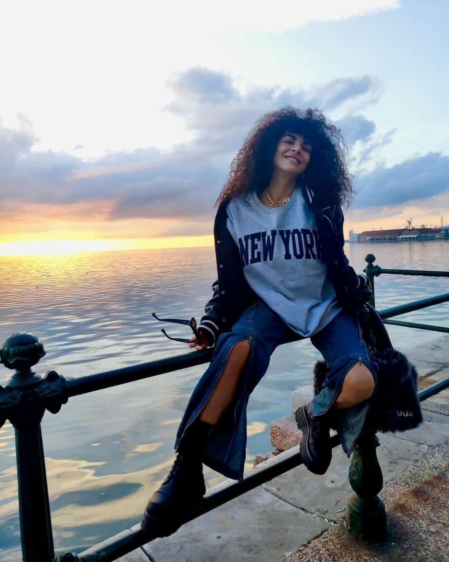 Φυσικά, η Μαρία το συνδύασε με το αγαπημένο της τζιν παντελόνι, χοντρό φούτερ με το logo «New York» στο στήθος, ενώ τα παπούτσια που επέλεξε είναι τα chunky αρβυλάκια της, που την έχουμε δει να τα φοράει κυριολεκτικά παντού.