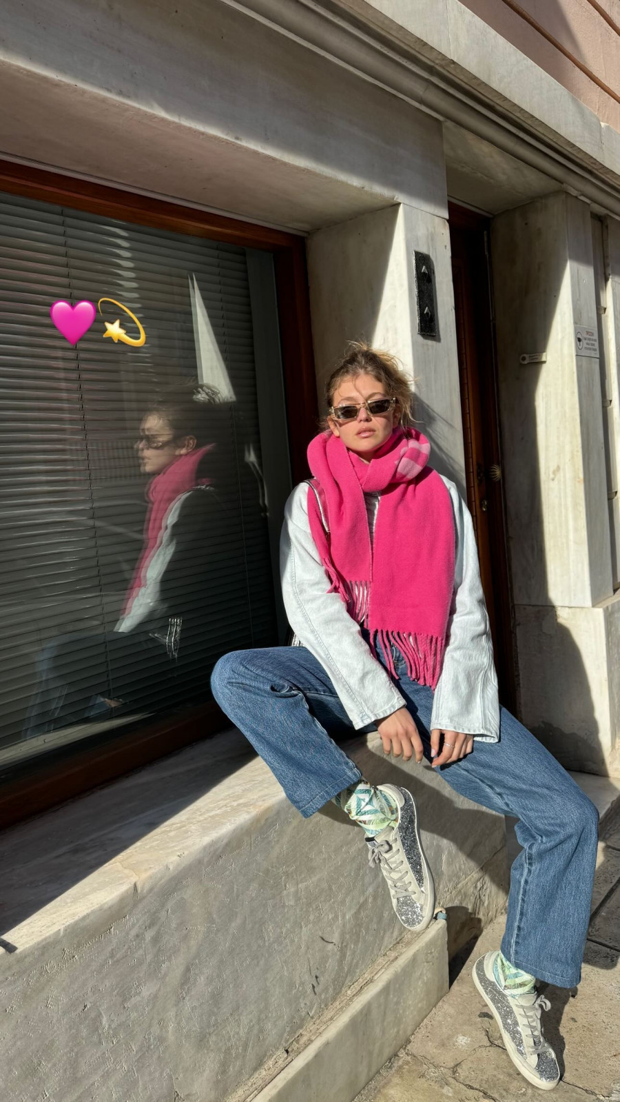 Το συγκεκριμένο ζευγάρι μαζί με το φούξια κασκόλ της και τις πολύχρωμες κάλτσες της ήταν που έδωσαν χρώμα και στυλ στο όλο look της ημέρας. Βάλε και εσύ ένα touch of glam στο ανοιξιάτικο στυλ σου με ένα ζευγάρι sparkly sneakers.