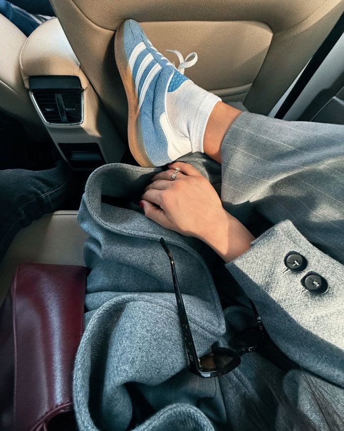 Τα αξεσουάρ της ήταν που έδωσαν χρώμα στο look, αφού την είδαμε να φοράει ένα ζευγάρι slim sneakers της adidas σε ανοιχτό μπλε. Τέλος η ίδια κατάφερε να βάλει και το βουργουνδί στο παιχνίδι, το πιο hot χρώμα του 2025 με ένα πουλόβερ που έφερε γύρω από τον λαιμό της σαν κασκόλ και μια bucket τσάντα στην ίδια απόχρωση.