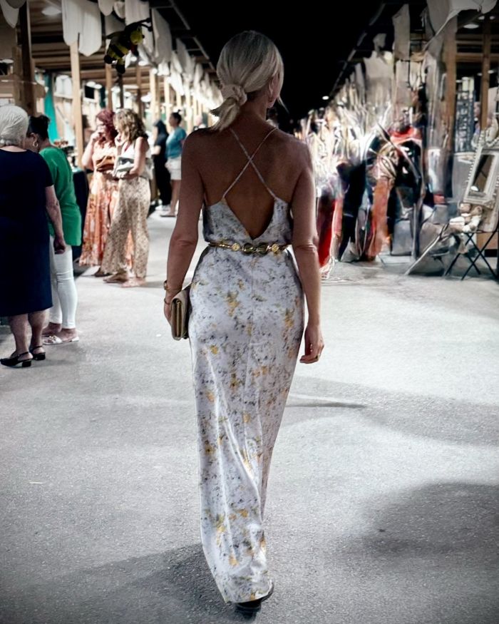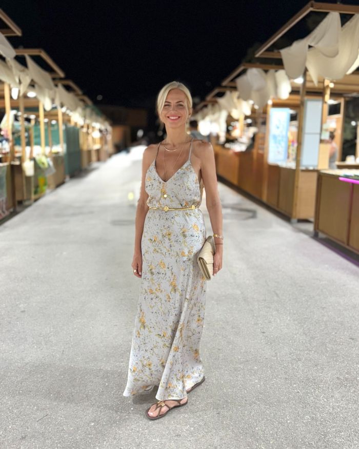 Η Χριστίνα Κοντοβά αναδεικνύει το lingerie dress ως σαγηνευτική επιλογή για βραδινές εξόδους στα νησιά, δίνοντάς του couture χαρακτήρα με λεπτή χρυσή ζώνη. Ένα τέλειο touch που αναδεικνύει τη μέση με διακριτική glam και καλοκαιρινή αίσθηση. Συνδύασέ το με minimal σανδάλια και ελαφρύ χτένισμα για ρομαντική και ανεπιτίδευτη διάθεση.
