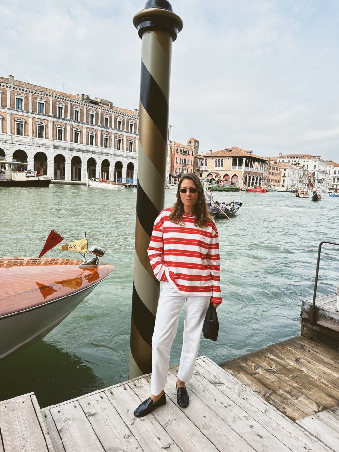 Σε μία από τις πιο πρόσφατες αναρτήσεις της, η Βίκυ επέλεξε ένα ριγέ φούτερ με κόκκινες και λευκές ρίγες, αποδεικνύοντας ότι το casual μπορεί να είναι και εξαιρετικά κομψό. Το συνδύασε με λευκό παντελόνι σε straight γραμμή και μαύρα loafers, ολοκληρώνοντας ένα look ιδανικό για πρωινές εμφανίσεις στην πόλη. Οι ρίγες, ένα από τα πιο διαχρονικά μοτίβα φέτος πρωταγωνιστούν σε μεγάλα prints με χρώματα και δίνουν χαρακτήρα στο outfit. Το λευκό παντελόνι που φόρεσε δημιούργησε το χρωματικό contrast που διατηρεί την απλότητα του συνόλου.