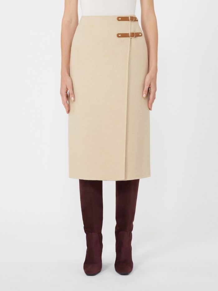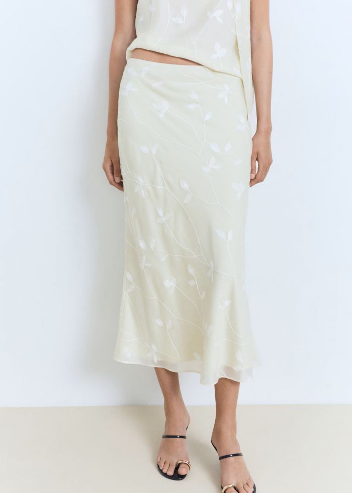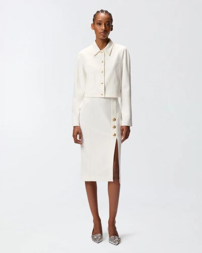 Η φούστα «Esme» από Brochu Walker, ένα brand από την California, ξεχώρισε για την εκλεπτυσμένη αισθητική της. Φτιαγμένη από μαλακό ιταλικό vegan δέρμα, σε κομψή ανοιχτή εκρού απόχρωση, αγκάλιαζε διακριτικά τη σιλουέτα της. Με στενή μέση, πλαϊνό φερμουάρ και μήκος λίγο κάτω από το γόνατο.