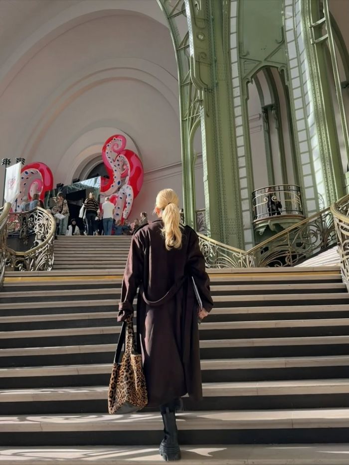 Στην πρώτη της εμφάνιση, η Κατερίνα επέλεξε ένα καφέ παλτό, ένα λαχταριστό καφέ στο χρώμα της ζεστής σοκολάτας το οποίο συνδύασε με μαύρο κολάν, ankle boots και μεγάλη λεοπάρ τσάντα. Ένα look άνετο αλλά και απόλυτα στυλάτο που το κάνει ιδανικό για βόλτες στους παριζιάνικους δρόμους και για cozy lunch.