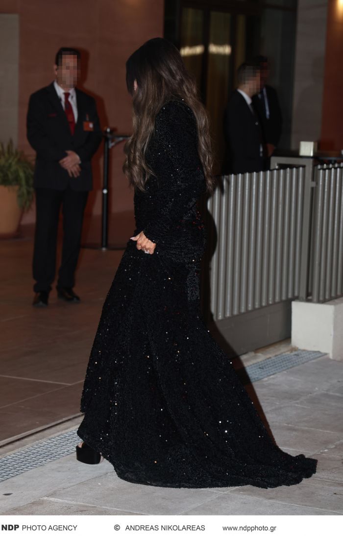 Για την πρώτη της δημόσια εμφάνιση στην Αθήνα, η Guilfoyle επέλεξε ένα μαύρο μακρύ φόρεμα με παγιέτες, σε ίσια γραμμή που αγκάλιαζε τη σιλουέτα της. Το look συμπληρώθηκε με μαύρες γόβες με χοντρή φιάπα, ενώ τα μακριά κυματιστά μαλλιά και το έντονο μακιγιάζ με smoky eyes χάρισαν μια αέρα old Hollywood κομψότητας. Ήταν μια εμφάνιση που συνδύαζε την διαχρονική εκκεντρικότητα με τη σύγχρονη λάμψη, ακριβώς αυτό που χαρακτηρίζει το προσωπικό της στυλ.