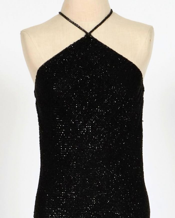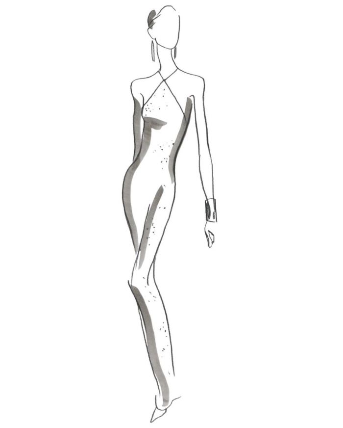 Το μαύρο, sleek φόρεμα με το halter neckline γλιστρούσε πάνω της με έναν τρόπο σχεδόν γλυπτικό, αναδεικνύοντας την απλότητα που χαρακτήριζε τότε τη συλλογή του Ralph Lauren. Δυνατές γραμμές, σμιλεμένες σιλουέτες και ένα γυαλιστερό, high-shine φινίρισμα που έκλεβε το φως χωρίς να φωνάζει.