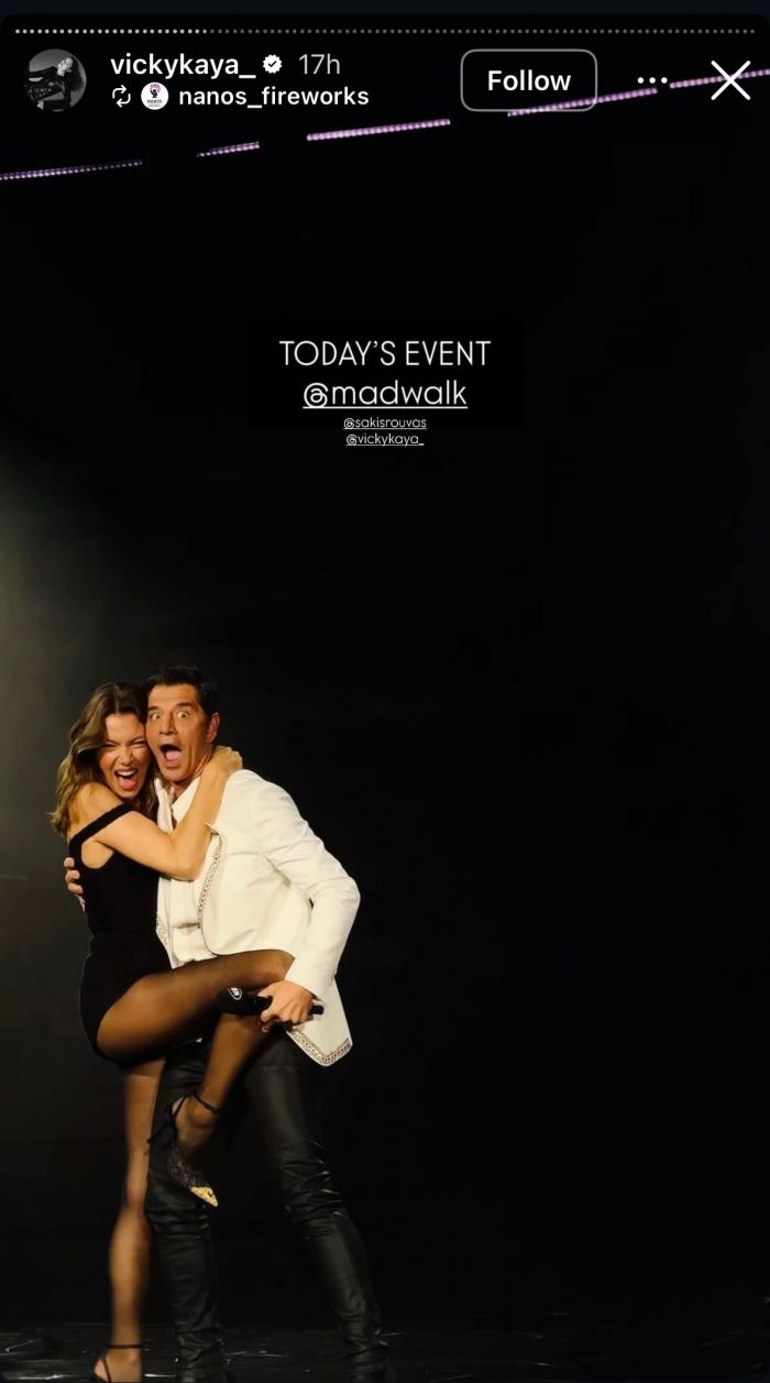 Ανοίγοντας τη βραδιά, η Βίκυ έκανε δυναμική είσοδο με ένα sleek, minimal αλλά ταυτόχρονα αισθησιακό μαύρο body συνδυασμένο με μαύρο διάφανο καλσόν, ένα look που έδενε αρμονικά με τα φωτιστικά εφέ της σκηνής και χάριζε μια υπερμοντέρνα, edgy αίσθηση. Η σιλουέτα της ξεχώριζε με αυτό το look με απόλυτη αυτοπεποίθηση.