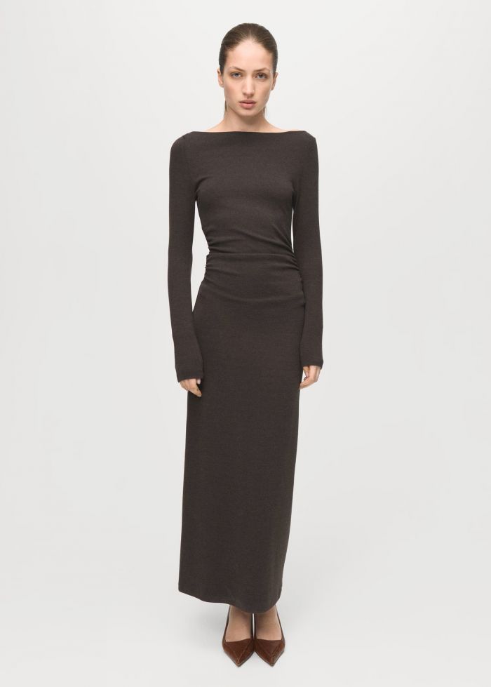Το βασικό στοιχείο της εμφάνισής της ήταν ένα ανοιχτό γκρι, μακρυμάνικο maxi φόρεμα, ένα κομμάτι ιδανικό για city strolls, με γραμμή που χαρίζει κίνηση και αέρινη αίσθηση. Πάνω από το φόρεμα, είχε ρίξει μια πιο σκούρα γκρι ζακέτα στον έναν ώμο.