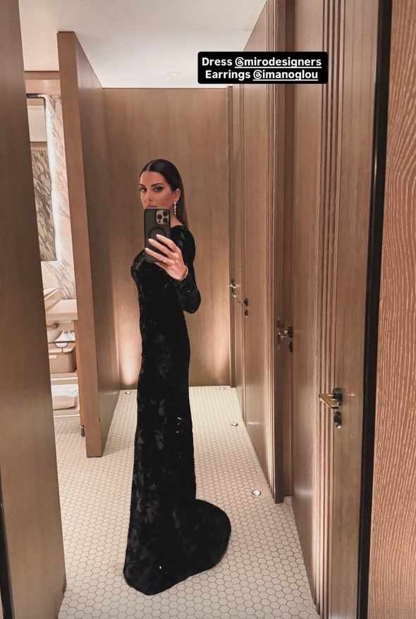 Η εγκυμονούσα Κατερίνα Καινούργιου έκλεψε επίσης τις εντυπώσεις με ένα μαύρο maxi off-shoulder φόρεμα σε λιτή γραμμή. Το look της ολοκληρώθηκε με χρυσά statement κοσμήματα, μια στυλιστική επιλογή που ήρθε και προσέθεσε ένταση και γιορτινή λάμψη.