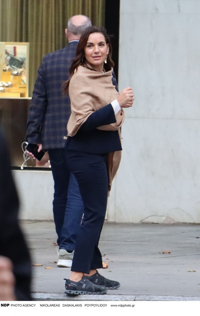 Το look ολοκληρώνεται με μπλε σκούρο σακάκι και λευκό πουκάμισο, έναν κλασικό συνδυασμό που πάντα εκπέμπει φρεσκάδα και luxury touch. Η επιλογή των παπουτσιών ήταν αυτή που έδωσε τον ξεκάθαρο sporty χαρακτήρα στο σύνολο, η Όλγα Κεφαλογιάννη επέλεξε σκούρα αθλητικά παπούτσια On, ένα από τα πιο δημοφιλή brands για άνετο αλλά stylish περπάτημα. Η λεπτομέρεια αυτή μετατρέπει το πιο κλασικό ντύσιμο σε μια sporty chic πρόταση που ταιριάζει τέλεια στο σύγχρονο urban lifestyle.