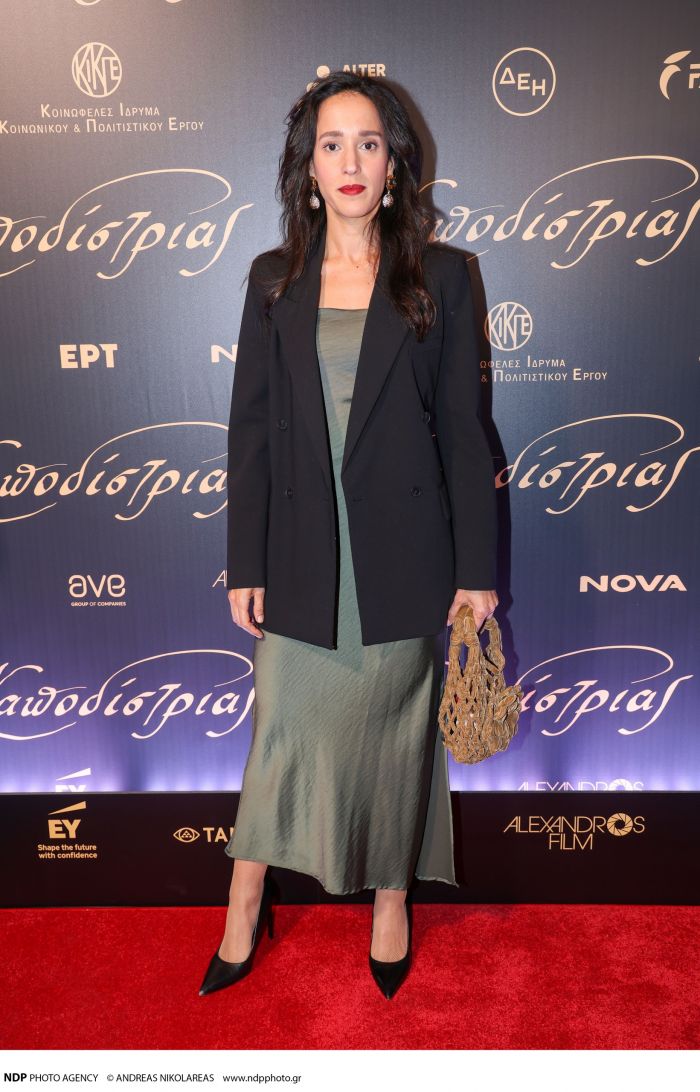 Φυσικά, δεν έλειψαν και τα πρόσωπα της ελληνικής showbiz. Η Σταματίνα Τσιμτσιλή εμφανίστηκε με ένα μαύρο βελούδινο midi φόρεμα, με εντυπωσιακά μακριά μανίκια και μια ασορτί λωρίδα υφάσματος στον λαιμό, που χάριζε στο look έναν αέρα παλιάς αίγλης. Το μαύρο καλσόν και τα μαύρα ανοιχτά πέδιλα διατήρησαν την αυστηρή κομψότητα, ενώ η μπεζ τσάντα φώτισε το σύνολο, κλέβοντας λίγη από τη λάμψη του εντυπωσιακού φορέματος.