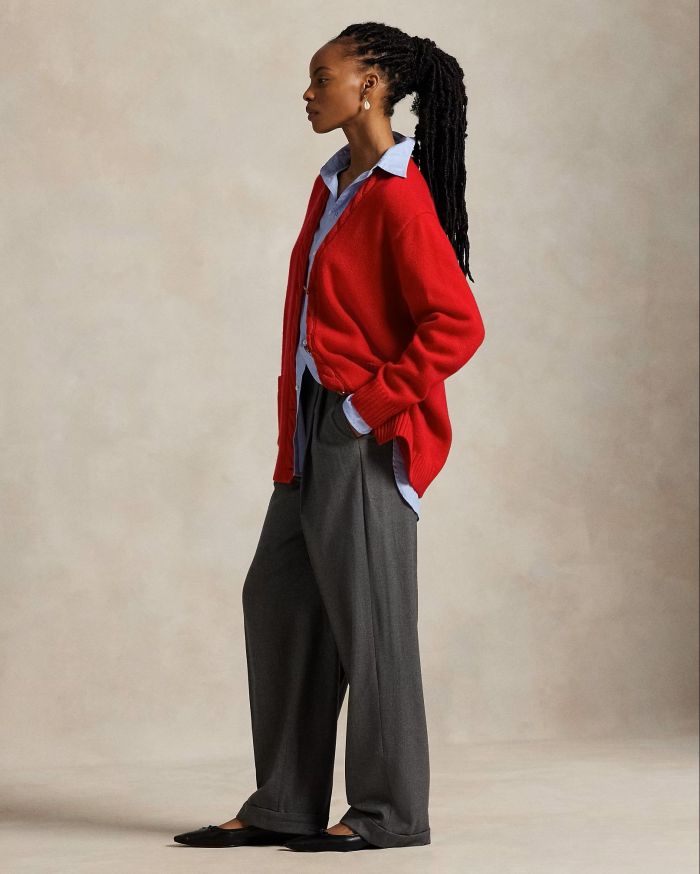 Η βάση του look ήταν ένα γκρι παντελόνι σε ίσια γραμμή, μια safe αλλά πάντα κομψή επιλογή, το οποίο συνδυάστηκε με λευκό crop top πουκάμισο, προσθέτοντας φρεσκάδα και μοντέρνο χαρακτήρα στο σύνολο. Τη διαφορά έκανε η ζακέτα σε festive κόκκινο χρώμα, μια πινελιά που έφερε αμέσως τη γιορτινή διάθεση και ζέστανε το outfit χωρίς υπερβολές αλλά και τα αξεσουάρ της. Παρόλο που κινήθηκαν σε minimal γραμμές ισορρόπησαν χρωματικά όλο το σύνολο. Τα ασημένια ballet flats, τα οποία πρόσθεσαν την απαραίτητη λάμψη αλλά και άνεση, ιδανική για βόλτες στην πόλη και η μαύρη τσάντα με τα μαύρα γυαλιά που ολοκλήρωναν τέλεια το σύνολο. Το αποτέλεσμα ήταν ένα look ευκολοφόρετο, chic και απόλυτα προσαρμοσμένο στο πνεύμα των ημερών.