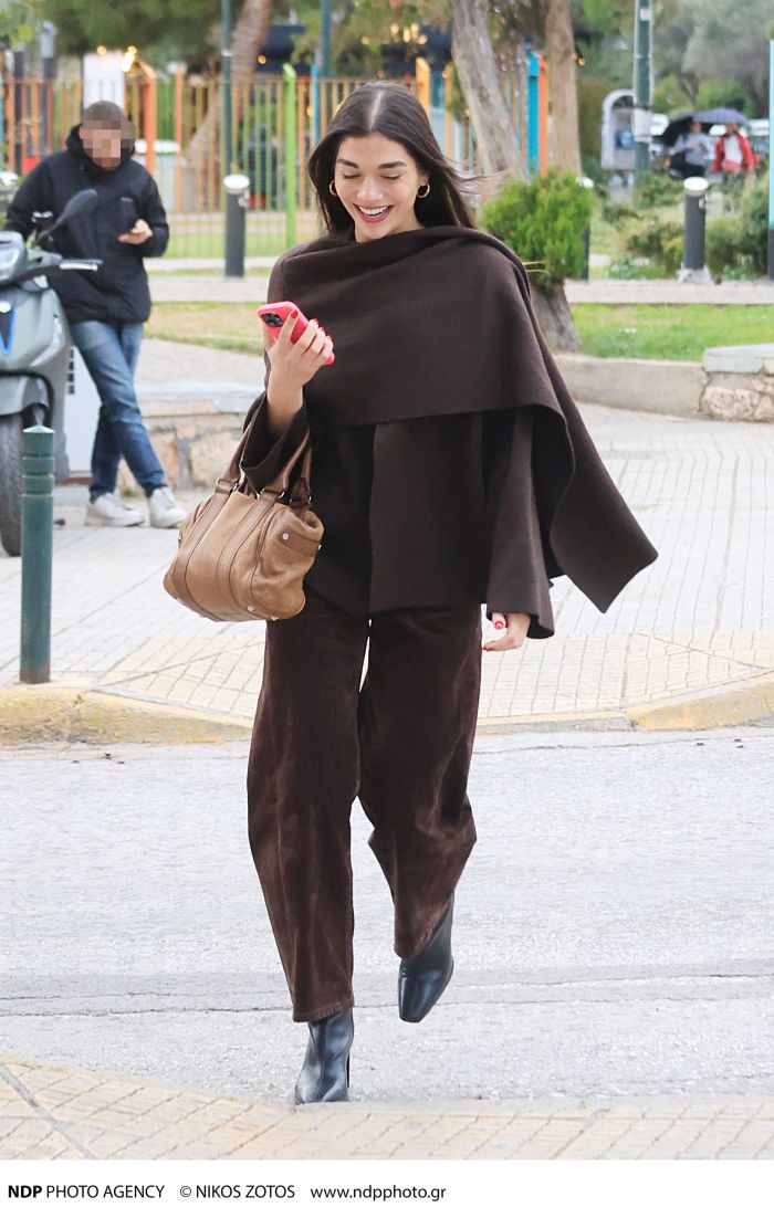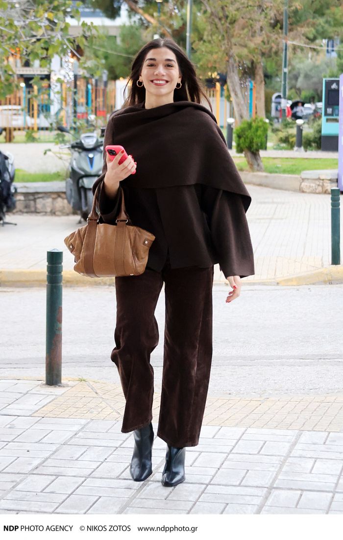 Στα αξεσουάρ, ξεχώρισε η καφέ–ταμπά τσάντα σε bowling σχήμα, μια διαχρονική επιλογή που αναβαθμιζει το σύνολο, ενώ τα μαύρα μποτάκια με τακούνι πρόσθετουν μεν ύψος αλλά και την κομψότητα στο σύνολο, παραμένοντας ταυτόχρονα άνετα και ιδανικά για περπάτημα.