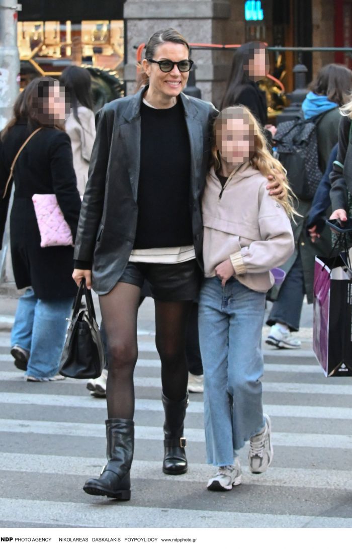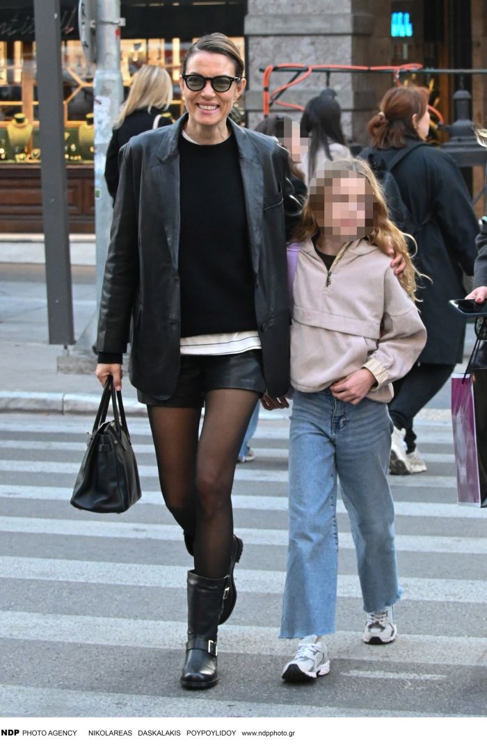 Η Βίκυ Καγιά μάς δείχνει πώς ένα leather look με shorts και καλσόν μπορεί να φορεθεί και σε μια casual πρωινή βόλτα στην πόλη. Η έξοδος με τη stylish κόρη της, Μπιάνκα.