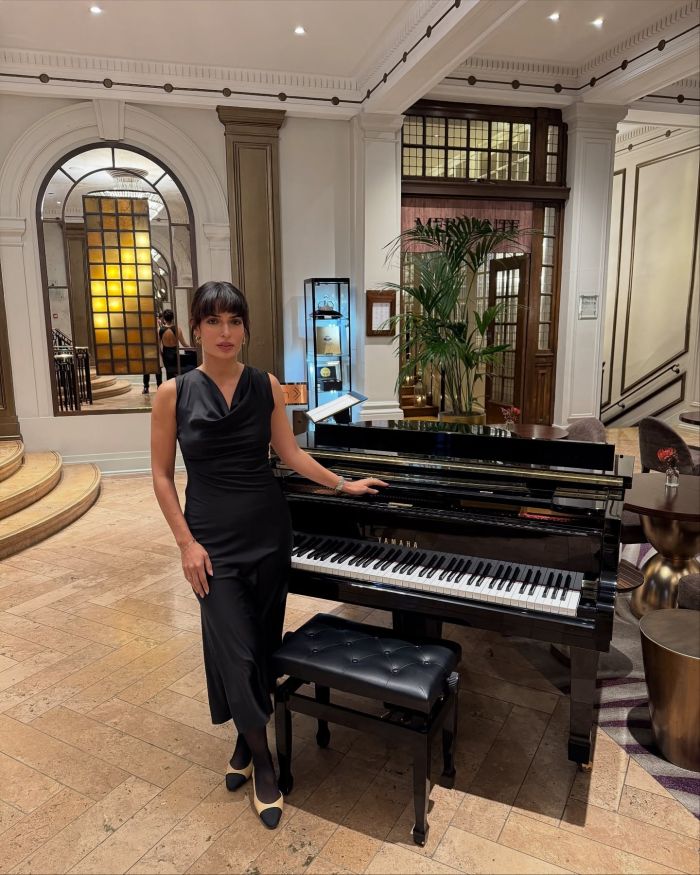 Τα μαλλιά και το μακιγιάζ κινήθηκαν σε φυσικούς τόνους, με έμφαση στη φρέσκια επιδερμίδα και το διακριτικό βλέμμα.