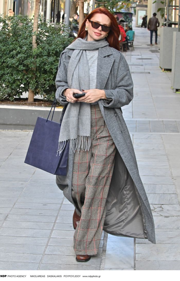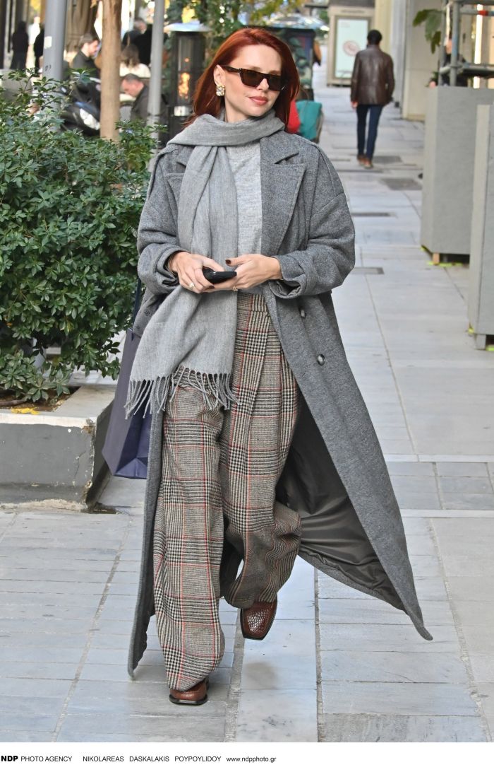 Η μονοχρωματική βάση σε αποχρώσεις του γκρι έδινε κομψότητα και διαχρονικότητα, ενώ το καρό παντελόνι μοτίβο πρόσθεσε ένα extra ενδιαφέρον εκεί που δεν το περιμένεις. Τα καφέ μποτάκια «έσπαγαν» τη χρωματική παλέτα, χαρίζοντας ζεστασιά στο σύνολο και δένοντας άψογα με το παντελόνι και φυσικά το χαρακτηριστικό χρώμα των μαλλιών της. Ένα look ιδανικό για τις χειμωνιάτικες βόλτες στην πόλη.